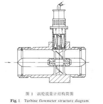 圖1所示為渦輪流量傳感器結(jié)構(gòu)簡圖[3].由圖1可見,當被測流體流過傳感器時,在流體作用下,葉輪受力旋轉(zhuǎn),其轉(zhuǎn)速與管道平均流速成正比,葉輪的轉(zhuǎn)動周期性地改變磁電轉(zhuǎn)換器的磁阻值.檢測線圈中的磁通量隨之發(fā)生周期性變化,產(chǎn)生周期性的感應(yīng)電勢,即電脈沖信號經(jīng)放大器放大后,送至顯示儀表顯示.渦輪流量計常用的實際流量方程為