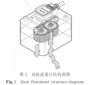 齒輪流量計屬于容積式流量計.齒輪流量計結(jié)構(gòu)簡圖見圖2.其工作原理為:流體在上游的壓力作用下進入流量計,推動一對嚙合的圓柱齒輪轉(zhuǎn)動.齒輪的齒頂圓和端面與殼體底座及殼體上蓋之間的間隙非常小,齒輪在轉(zhuǎn)動過程中,輪齒把流動的液體連續(xù)不斷地分割成單個的體積單元,每個體積單元等于兩個輪齒的容積.齒輪每轉(zhuǎn)動一個齒距的角度,排出等于兩個輪齒容積的流體體積.在殼體上蓋對應(yīng)測量齒輪分度圓處安裝兩個電磁轉(zhuǎn)速傳感器,齒輪轉(zhuǎn)動時,輪齒每次經(jīng)過電磁轉(zhuǎn)速傳感器,流量計發(fā)出一個電脈沖信號.根據(jù)流量計發(fā)出的脈沖數(shù)可以測量流體的流量。