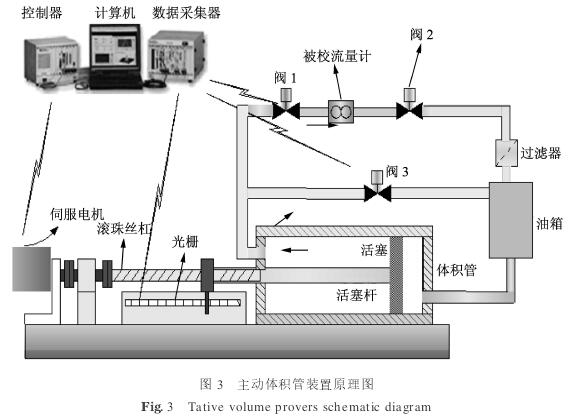 工作原理:校準前開啟閥1, 2,關(guān)閉閥3,由伺服電機通過滾珠絲杠帶動活塞在主動體積管中運動,產(chǎn)生標準流量源(標準流量的大小由上位機軟件通過調(diào)節(jié)電機轉(zhuǎn)速進行控制),液體通過閥1流經(jīng)被校流量計,*終流入油箱.光柵用于測量活塞行程,活塞行程與活塞截面積的乘積再除以運行時間就得到體積流量,通過比較被校流量計的示值與體積管測量的標準體積流量值實現(xiàn)流量計的校驗.