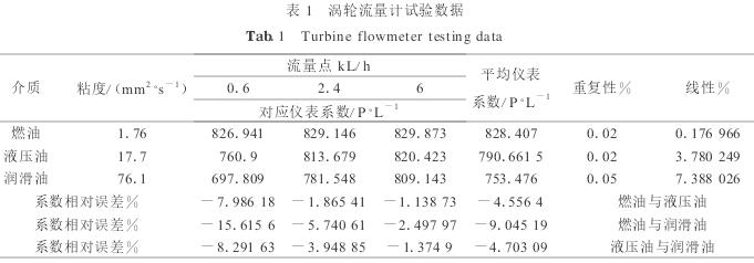 本文選取了常用國產(chǎn)渦輪LWGY-15與德國KRACHT公司VC5齒輪流量計為樣本,分別在燃油、液壓油、潤滑油流量裝置上進行了實驗.實驗數(shù)據(jù)如表1、表2所示.
