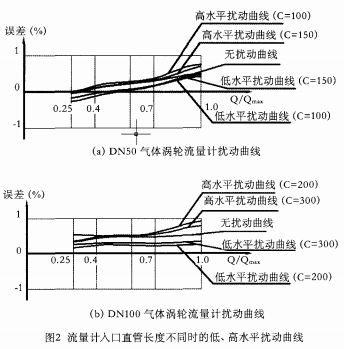 (2)隨著流量計(jì)表前直管段的加長(zhǎng),流量計(jì)高、低水平擾動(dòng)的曲線基本上是逐漸接近無(wú)擾動(dòng)的曲線;