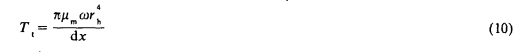 文獻(xiàn)認(rèn)為流體在兩個(gè)葉片之間流動(dòng)時(shí),軸承外表面上的作用力與軸平行。實(shí)際上,流體是以一定角度通過葉片的,所產(chǎn)生的阻力矩不能忽略。采用與式(3)類似的動(dòng)量方程,軸表面上的速度取x的四次冪分布(W=Cx4),可以得出Ta的表達(dá)式為