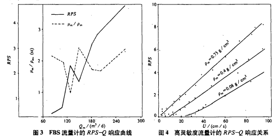 多相流動(dòng)中,U和μm/ρm隨溫度、壓力、油氣水的含量的變化而變化。圖3是利用斯倫貝謝的FBS流量計(jì)由實(shí)驗(yàn)作出的RPS-Q響應(yīng)曲線,從圖中可見,隨μm/ρm的突變,RPS值也發(fā)生了響應(yīng)的劇烈變化。