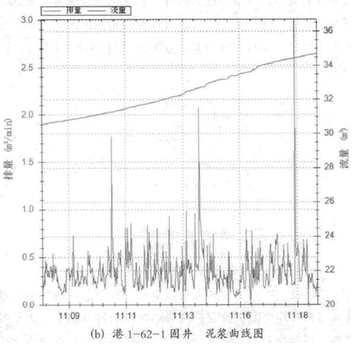 從圖2中可以看出,水泥漿排量曲線比較穩(wěn)定,紋波為0.05m³/min,基本可以認(rèn)為是渦輪的偶發(fā)跳動或者采集設(shè)備的紋波導(dǎo)致,水泥漿的累積流量基本形成一條直線上升。泥漿排量本應(yīng)該是0m³/min,實際曲線上可以看出很不穩(wěn)定,從11: 03: 53之后,*大能夠達到1.06m³/min,一眼看過去就會感覺是雜亂無章的波形,泥漿的累積流量本應(yīng)該是一條水平線,結(jié)果變成了一條不規(guī)則的斜線。