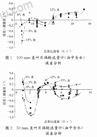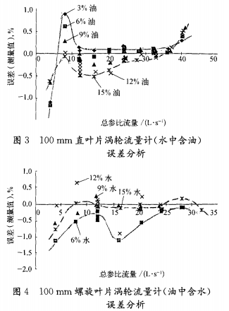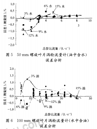 3)油中含水與水中含油兩者誤差變化的差異。渦輪流量計測量水中含油*二組分體積分?jǐn)?shù)變化引起測量誤差變化比油中含水大。