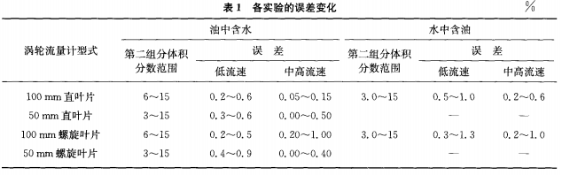 油水混合液在水平管道內(nèi)靜止時油和水是分層的;在開始流動或很低流速時處于油水兩層的分層流;隨著流速增加油水逐漸混合,流速愈大兩相混合愈均勻;當(dāng)進入渦輪葉片轉(zhuǎn)動時兩相混合將更為均勻。因此,混合液兩相均勻程度是影響測量誤差的因素之一。