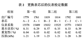 將每組儀表的2臺表芯對換,重新進行檢定,獲取檢定數(shù)據(jù),列于表2。將同表芯的2臺儀表參數(shù)進行比較,獲得比對結果,列于表3。其中儀表系數(shù)以相對(百分數(shù))表示。