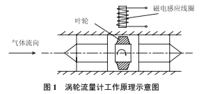 1、渦輪流量計(jì)的測(cè)量原理渦輪流量計(jì)是一種速度式流量?jī)x表,測(cè)量本體是渦輪流量傳感器,主要由葉輪和磁電感應(yīng)線圈組成,葉輪軸心與管道中心相同,可以自由轉(zhuǎn)動(dòng),其葉片與氣體流動(dòng)方向成一定角度。在流體沖擊下,渦輪沿管道軸向旋轉(zhuǎn),其旋轉(zhuǎn)速率隨流量變化而不同,流速越高,動(dòng)能越大,渦輪的轉(zhuǎn)速也越高。渦輪的轉(zhuǎn)速經(jīng)磁電感應(yīng)轉(zhuǎn)換器轉(zhuǎn)換為相應(yīng)頻率的電脈沖,通過顯示儀表進(jìn)行積算和顯示(圖1)。