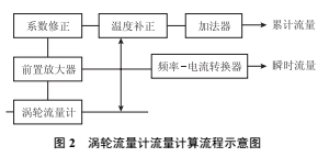 渦輪流量計(jì)通過不同的計(jì)算方法,可分別顯示累計(jì)流量和瞬時(shí)流量。當(dāng)渦輪葉片切割殼體內(nèi)永久磁鋼產(chǎn)生的磁力線時(shí),將引起傳感線圈磁通的變化,磁通周期變化信號(hào)經(jīng)前置放大器放大、整形,產(chǎn)生與流速成正比的脈沖信號(hào),脈沖信號(hào)經(jīng)流量積算電路換算后顯示累積流量值,同時(shí)經(jīng)頻率電流轉(zhuǎn)換電路轉(zhuǎn)換成模擬電流量,進(jìn)而顯示瞬時(shí)流量值(圖 2)。