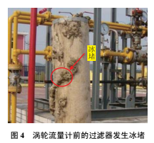 通過逐項(xiàng)排查,發(fā)現(xiàn)流量計(jì)前面的過濾器和流量計(jì)后的調(diào)壓裝置存在一定程度的冰堵(圖4)。采取管道排污、輔助加熱、清洗過濾器及調(diào)低流量計(jì)入口壓力至4.0MPa等措施,改善了天然氣的節(jié)流效應(yīng),使渦輪流量計(jì)能夠正常運(yùn)行。經(jīng)與下游門站渦輪流量計(jì)比對(duì),輸差控制在有效范圍。