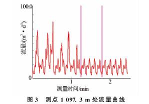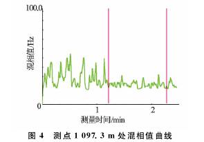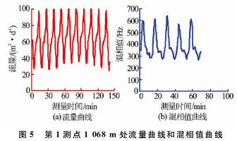 T-××-××1井是大慶油田采油五廠1口水驅(qū)產(chǎn)出井,采用阻抗式含水率計在該井進行了測試。圖3、圖4分別為測點深度1097.3m測量的流量及混相值曲線圖。2min的采樣時間內(nèi),流量及混相值曲線波動劇烈,明顯受井下產(chǎn)氣影響,進行平均值計算時只能取后半段較平穩(wěn)的數(shù)據(jù),因此,測試時需延長測量時間。錄取不同范圍數(shù)值時流量及含水率測量差值較大,流量平穩(wěn)段為14.81m3/d,高值時達到23.52m3/d;取不同測量段的混相值時測量含水率*大相差12%。重復(fù)測量得到了相同的測量結(jié)果。由此可見,氣體對流量及含水率測量產(chǎn)生了非常大的測量誤差。
