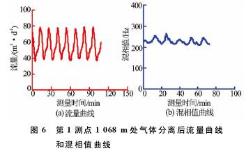 B2-××-××2井是大慶油田采油一廠1口水驅(qū)產(chǎn)出井,該井井口計量產(chǎn)液51.72m3/d,取樣化驗含水率81.8%。采用阻抗式含水率計在該井進行了測試,圖5為*1測點深度1068m測量的流量及混相值曲線圖。圖5的流量曲線表明,流量曲線受氣體影響較大,測量流量波動較大,在25~98m3/d之間波動,平均值為58.6m3/d;混相值波動也很大,在280~640Hz之間劇烈波動,平均值圖5*1測點1068m處流量曲線和混相值曲線388Hz。該井測量流量為65.8m3/d,測量含水為51.3%,受井下產(chǎn)氣影響明顯,測量流量明顯高于井口計量流量,測量含水率明顯低于化驗含水率。同時,在該井測井時,使用了儀器上裝有氣體分離器的阻抗式含水率計在該井進行測試,*1測點的流量及混相值曲線見圖6。由于氣體分離器將氣體分離,未進入測量通道,減小了氣體對測量傳感器的影響,測量的流量及混相值曲線波動明顯減少,流量波動為36~78m3/d,平均值為55m3/d;混相值波動為211~288Hz,平均值為228Hz。測量流量為54.8m3/d,測量含水率為80.4%,與井口計量非常接近。對比測量結(jié)果表明,氣體對流量及含水率測量造成了非常大的測量誤差,已不能進行準(zhǔn)確測量。