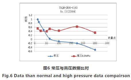 為了確認高壓渦輪流量計在高壓氣體介質中計量性能是否滿足工業(yè)貿易計量要求,將多臺DN80-G160 樣機發(fā)往*三方檢測機構**石油天然氣大流量計量站南京分站進行6 MPa 實流檢定;檢定合格,準確度等級為1.0 級,相對于常壓檢定數據樣機的儀表系數K 有所偏移,但仍在允許誤差范圍內。其中南京分站使用小流量標準裝置對編號為131228041 的DN80 渦輪流量計進行檢定,該樣機在常壓與高壓檢定比對數據如圖6 所示。而流量計的儀表系數K 的計算如下: