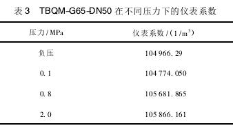 (1)根據(jù)式(6)計算出的在不同工作壓力下流量計儀表系數(shù)的重復(fù)性,說明渦輪流量計儀表系數(shù)受壓力變化的敏感性較小。TBQM-G65-DN50在4種不同壓力下流量計儀表系數(shù)變化的重復(fù)性僅為0.502%,而TBQM-G100-DN80的重復(fù)性僅為0.282%。