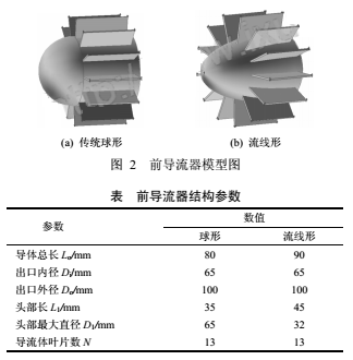 由于ρ和v為流體流動參數,不能隨意增減,因此只能盡量減小壓損系數α,以達到降低壓損的目的。壓損系數除了受流體粘性、管徑及管長等因素影響外,與流量計內部各部件的幾何結構有密切關系。文獻通過試驗發(fā)現葉輪的形線、葉片數對壓力損失的影響較小(≤3%),因前導流器對流量計有著重要作用,故將傳統(tǒng)的球形前導流器改進為流線形,考察兩者在流動減阻方面的不同,進而分析對流量計性能的影響程度。DN100渦輪流量計改進前后的前導流器結構如圖2所示,幾何參數見下表。