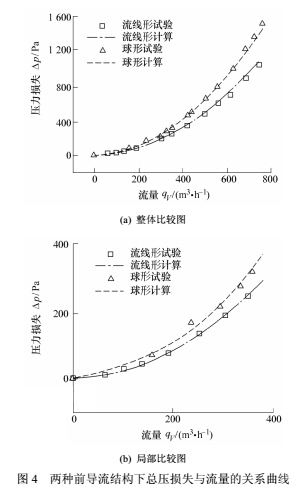 圖4為兩種前導流結構下總壓損失與流量的關系曲線。圖4b為圖4a在量程為0~400m³/h區(qū)間的曲線圖。