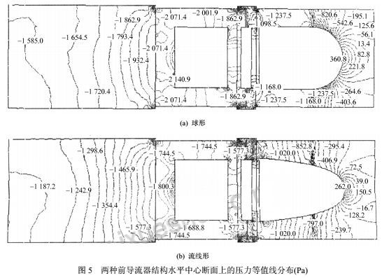 圖5為兩種前導流器結構水平中心斷面上的壓力等值線分布,宏觀上,圖5a、5b的壓力變化趨勢是一致的:在前導流器、葉輪和支架部分,壓力均不同程度地降低,由支架進入尾流區(qū)后,壓力逐步上升。