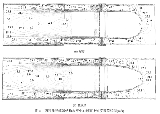 圖6為與圖5相同位置上的速度等值線分布。在前導流器處,可看出對應壓力變化劇烈的區(qū)域,速度變化也較大。球形頭部速度急劇增大、直管段速度幾乎不變的分布趨勢使其中心出口速度(47.0m/s)較大(流線形45.2m/s),在同流量下表明球形前導流器具有較大速度梯度。當氣流進入尾流部分后,由于流道突擴,在支架的背面形成明顯的低速渦區(qū),之后管壁附近速度降低,中心區(qū)主流速度回升,速度值被逐漸拉平,對應壓力也逐步回升??煽吹剑脸隹跀嗝?,流線形的速度不均勻*大差值為6.0m/s,球形為9.4m/s,即球形的出口速度梯度更大,壓力回升則相應較慢。