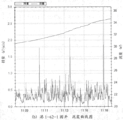 在固井全程的曲線中,也可以發(fā)現(xiàn)開(kāi)始固井的時(shí)候.泥漿排量雜波較小,究其原因是剛開(kāi)始固并時(shí),泥漿管線剛泄壓,管線中還是充滿了液體,雖然振動(dòng)強(qiáng)度雷同.但是葉片有阻尼,振幅較小.對(duì)其影響也較小。例如曲線圖的11;03: 00-11: 03: 53之間的泥漿排量沒(méi)有雜波。在港1-62-1固井過(guò)程中,水泥漿打了413澎,結(jié)果本應(yīng)該是0的泥漿,卻走數(shù)了23.0 m',其影響可謂巨大.并非通過(guò)普通的濾波或切除所能排除,必須執(zhí)行一個(gè)特殊算法。