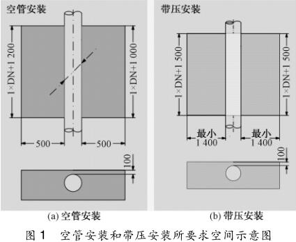 (1)要確認(rèn)在用食用油計量表的管壁厚度及內(nèi)襯材料特性,保證換能器在管段內(nèi)壁的突出長度;(2)用氣焊切割食用油計量表外殼時,一定要在管道內(nèi)充滿水的情況下(*好是帶壓并繼續(xù)保持管內(nèi)水在運行流動的狀態(tài))進(jìn)行,以免內(nèi)襯受熱凸起變形影響流態(tài);(3)要有足夠安裝空間(流量井),可以用原有的流量井,但管壁與流量井墻壁*小距離不小于 500 mm,流量井長不小于 1. 5 倍管徑。超聲波流量計空管安裝和帶壓安裝要求空間如圖 1 所示。