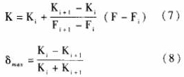 輪流量傳感器的儀表系數(shù)K與Q的關(guān)系近似線性的單調(diào)函數(shù)(見(jiàn)圖2)。因此,在對(duì)檢定結(jié)果進(jìn)行處理時(shí),直接將各檢定點(diǎn)的檢定結(jié)果以Fi、Ki的形式存入重油流量表的數(shù)值運(yùn)算部分,不必對(duì)其儀表系數(shù)取平均值。在使用渦輪流量傳感器進(jìn)行流量測(cè)量時(shí),根據(jù)渦輪流量傳感器的信號(hào)頻率F,即可在以上檢定結(jié)果中檢索各F,值,找出滿足F,≤F≤F的Fi、Fi+1(i=1,2,.,.n-1),n是該渦輪流量傳感器的流量檢定點(diǎn)數(shù);若信號(hào)頻率F=Fi或F=Fi+1,則相應(yīng)的Ki或K.i+1即為所需的儀表系數(shù);若信號(hào)頻率Fi