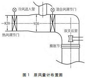 從流量測量角度講,影響流場的主要為熱風調門、擴管、彎頭以及一次冷風的混入,閘板門和混合風調門由于運行時處于全開狀態(tài),影響可忽略,目前使用了單點雙文丘里管的測量方式,有以下問題: