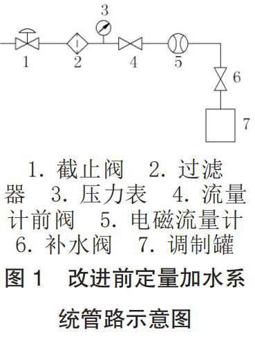 工廠的香料廚房系統(tǒng)為國內(nèi)煙機(jī)公司 2004 年設(shè)計制造,其定量加水系統(tǒng)主要由水源、煤油流量計、加水管路元件和控制程序這四部分組成,改進(jìn)前管路示意圖如圖 1 所示。