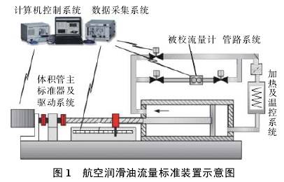 圖1是航空潤滑油流量校準(zhǔn)裝置示意圖。裝置采用伺服電機(jī)驅(qū)動標(biāo)準(zhǔn)計(jì)量油缸的結(jié)構(gòu)形式,主要由計(jì)量油缸、電機(jī)及控制器、滾珠絲杠、直線導(dǎo)軌、校準(zhǔn)管路、切換閥門、油箱、控溫機(jī)組、溫度壓力傳感器、精密光柵尺、數(shù)據(jù)采集系統(tǒng)、控制計(jì)算機(jī)等部件構(gòu)成。裝置采用伺服電機(jī)驅(qū)動標(biāo)準(zhǔn)計(jì)量油缸產(chǎn)生標(biāo)準(zhǔn)流量源,計(jì)量油缸同時作為容積標(biāo)準(zhǔn),與光柵配合構(gòu)成流量測量系統(tǒng)。校準(zhǔn)裝置通過調(diào)節(jié)控制介質(zhì)溫度而改變介質(zhì)粘度。標(biāo)準(zhǔn)裝置技術(shù)指標(biāo)為:流量范圍:0.5~160L/min;擴(kuò)展不確定度:0.05%(k=2);溫度范圍:20~120℃。