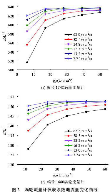 研究利用航空潤滑油流量標(biāo)準(zhǔn)裝置在20,30,40,50,60,80℃對10支甲醇流量計(jì)進(jìn)行校準(zhǔn)試驗(yàn)。CL-10型流量計(jì)校準(zhǔn)流量點(diǎn)分別為6,17,28,39,50L/min;CL-15型流量計(jì)校準(zhǔn)流量點(diǎn)分別為12,24,36,48,60L/min。圖2是1748和1660兩支甲醇流量計(jì)在各粘度點(diǎn)儀表系數(shù)隨流量變化曲線。