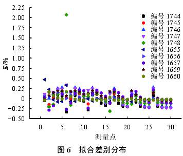 選取與以上要求的9個關(guān)鍵雷諾數(shù)相近的流量點(diǎn)數(shù)據(jù)進(jìn)行擬合,并與全數(shù)據(jù)擬合結(jié)果進(jìn)行比較,兩者差別通過式(9)進(jìn)行評估。圖6是兩種擬合方式差別分布情況。300對數(shù)據(jù)點(diǎn)中,僅有1點(diǎn)儀表系數(shù)差別超過2%,其他各點(diǎn)差別均小于0.5%,而且99%以上的數(shù)據(jù)點(diǎn)差別小于±0.33%,86%以上的數(shù)據(jù)點(diǎn)差別小于±0.20%。