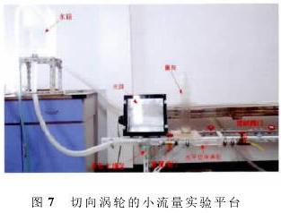 為了驗證仿真的準確性,通過室內(nèi)實驗對其驗證。切向渦輪采用可視化研究平臺,整個渦輪的結(jié)構(gòu)都采用亞克力板雕刻組裝而成。如圖7所示,水箱主要提供穩(wěn)定水壓,水平切向渦輪做成開口系統(tǒng)并放置在實驗支撐架上,前置閥門可控制水流,在需要更換切向渦輪的零件時可關(guān)閉,控制閥門主要是控制流經(jīng)切向渦輪的流量,流量測量仍采用傳統(tǒng)可靠的容積時間法。實驗時以染色劑作為示蹤劑,以觀察流場的分布情況。