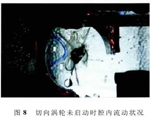 如圖8所示,記錄的是未啟動時切向渦輪內(nèi)的流場,水從圖8左側(cè)流入渦輪,從右側(cè)流出,實驗時水的流速很低(0.05m3/d),腔體1中的流動可近似看作不可壓縮無旋繞角流動,此時流體在腔體1中的速度可看成對稱分布,由伯努利方程算得的壓強也是對稱分布,此時2個壁面幾乎沒有壓強差,所以渦輪未啟動。