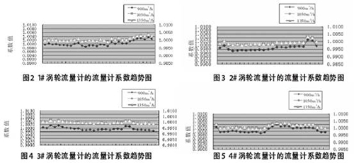 設(shè)有1套在線分析系統(tǒng),對原油密度、黏度和含水等**進(jìn)行檢測。柴油流量表的檢定采用體積管在線檢定,采用體積管對這4臺流量計檢定的流量計系數(shù)(流量計系數(shù)是流量計基本誤差的一種表示方法,貿(mào)易交接量=流量計讀數(shù)×流量計系數(shù))趨勢圖如圖2~圖5所示。