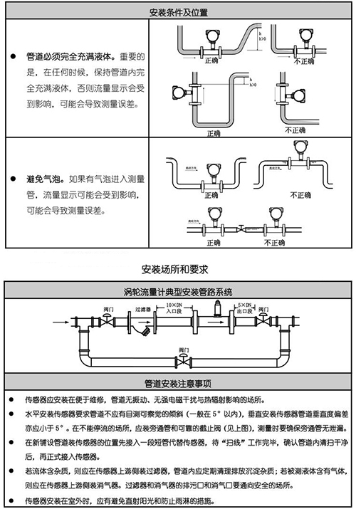 渦輪流量傳感器可水平、垂直安裝,垂時(shí)流體方向必須向上。液體應(yīng)充滿管道,不得有氣泡。安裝時(shí),液體流動(dòng)方向應(yīng)與傳感器外殼上指示流向的箭頭方向一致。直管段內(nèi)壁應(yīng)光滑清潔,無(wú)凹痕、積垢和起皮等缺陷。