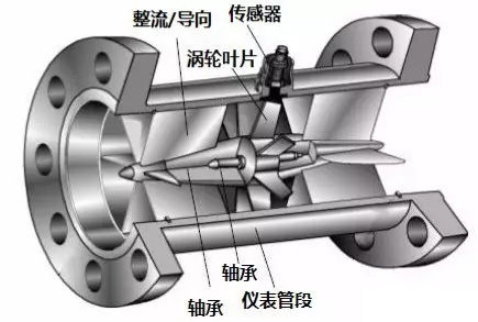 下圖就是一款智能一體化渦輪流量計的透視圖,可以看到流量計的管道中心安放了一個渦輪,渦輪兩端由軸承支撐。