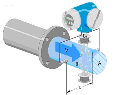 據(jù)法拉*電磁感應(yīng)原理,在與測量管軸線和磁力線相垂直的管壁上安裝了一對檢測電*,當(dāng)導(dǎo)電液體沿測量管軸線運(yùn)動(dòng)時(shí),導(dǎo)電液體切割磁力線產(chǎn)生感應(yīng)電勢,此感應(yīng)電勢由兩個(gè)檢測電*檢出,數(shù)值大小與流速成正比例,其值為: