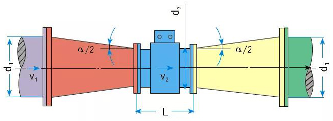所以在有些流速偏低工況下,為了使污泥流量計工作在合適的流速范圍,允許有一定的壓力損失時,可以選擇流量計傳感器的口徑小于管道口徑,在儀表前后增加異徑管,提高介質(zhì)流速。異徑管的中心錐角α不大于15°,可以視為直管,如圖5。