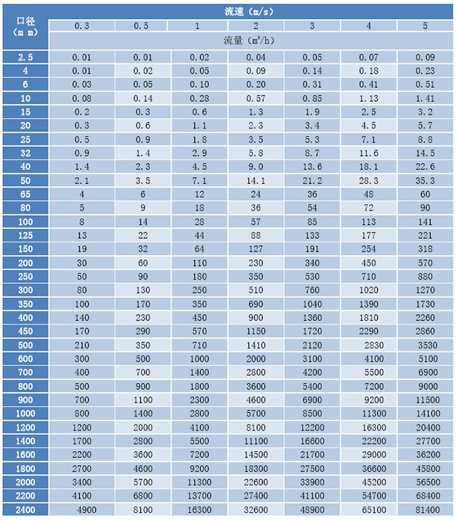(3)流量計流速、口徑、流量對應(yīng)表