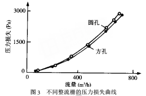 圖3是只改變整流柵條件下,流體經(jīng)過流量計(jì)的壓力損失曲線。由圖知,盡管方孔整流柵比圓孔增大了萬(wàn)方數(shù)據(jù)的通流面積,但對(duì)流體壓損的影響并不明顯。在小于300m³/h的范圍內(nèi),兩者幾乎沒有差別,在Q=700m³/h處,方孔整流柵*大使壓損降低300Pa,比圓孔整流柵改善約10%,在工作范圍60~600m³/h內(nèi),方孔比圓孔平均改進(jìn)約2%,但方孔加工難度大于圓孔,因此,應(yīng)根據(jù)實(shí)際情況選擇整流柵。
