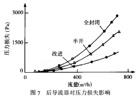 圖7為分別采用三種后導(dǎo)流器而其余部件不變條件下流量計(jì)的壓力損失曲線。由圖可知,在流量為0~100m³/h范圍內(nèi),三種結(jié)構(gòu)的壓力損失均很小,可以認(rèn)為壓力損失在小流量工況下對(duì)幾何結(jié)構(gòu)不敏感,即后導(dǎo)流器的幾何形狀變化還沒有對(duì)壓損產(chǎn)生影響。隨著流量的增大,三條曲線明顯拉開了距離,其中全封閉式壓損增長(zhǎng)*快,半開式次之,壓損*小的是改進(jìn)式,在額定*大流量600m³/h處,改進(jìn)式壓損僅為700Pa,約為半開式壓損的1/2,為全封閉式壓損的1/3。當(dāng)流量進(jìn)一步增大,這種差距還將隨之增加。由此可見,選擇合適的導(dǎo)流器可以大大降低流量計(jì)的壓力損失。在流量計(jì)的工程應(yīng)用中,有必要對(duì)前、后導(dǎo)流器幾何參數(shù)進(jìn)行優(yōu)化,以達(dá)到*小壓損目的。