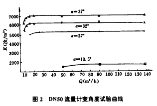 對(duì)DN50流量計(jì)分別做了a為13.5°、27°、32°和37°變角度試驗(yàn),其結(jié)果見(jiàn)表2和圖2。