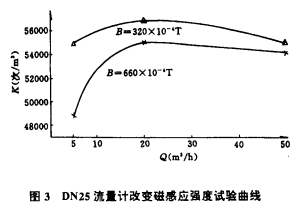 位于流量計(jì)之上,緊貼殼體處安裝著磁電轉(zhuǎn)換器,它將對(duì)渦輪葉片(由鐵磁性材料制成)產(chǎn)生一個(gè)恒定的磁性阻力矩。無(wú)論葉片處在靜止或轉(zhuǎn)動(dòng)過(guò)程中都將始終受到這一磁力作用。這一磁力將直接影響著流量計(jì)的性能,尤其小流量時(shí)影響更大。為了研究該磁力對(duì)流量計(jì)性能的影響情況,我們選取適當(dāng)?shù)拇鸥袘?yīng)強(qiáng)度,對(duì)同一臺(tái)DN25流量計(jì)進(jìn)行了變磁感應(yīng)強(qiáng)度B的影響試驗(yàn),其試驗(yàn)結(jié)果見(jiàn)表3和圖3。