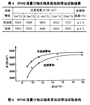 通過(guò)試驗(yàn)表明,潤(rùn)滑油對(duì)流量計(jì)小流量的性能的影響較大,隨著流量的增大,兩條曲線之間的差值逐漸減小。由于軸尖和軸承的摩擦阻力很小,并且采用硬質(zhì)合金材料制成,耐磨性很強(qiáng),故建議流量計(jì)在出廠標(biāo)定前可以不必加入潤(rùn)滑油。