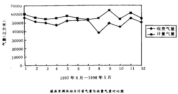 服務(wù)站封閉計(jì)量就是在該服務(wù)站管轄的所有調(diào)壓站均安裝計(jì)量表。比如京津服務(wù)站有車輛廠、揚(yáng)橋、白廟、席場4個(gè)調(diào)壓站和1個(gè)調(diào)壓拒,上述站、拒裝計(jì)量后就成為封閉計(jì)量。封閉計(jì)量使服務(wù)站有了考核本站上萬戶用氣量的總計(jì)量表,從而可明顯知道本站的供銷差封閉計(jì)量的重要意義和它能產(chǎn)生的經(jīng)濟(jì)效益,目前尚不能從已投人l0萬元資金剛開始試驗(yàn)運(yùn)行的京津站得到論證(但到今年底會(huì)有確切結(jié)論),目前可以引用97、98年原河北所謙益里調(diào)壓站的計(jì)量統(tǒng)計(jì)資料來簡單說明它的重要意義。(見下圖及文后附統(tǒng)計(jì)表)