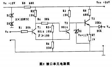 調(diào)試時,先將接口單元的輸出端接1k電阻,然后將輸入端接1.5V電壓,逐步減小電阻R5的值,直至輸出端電壓上升到10V;若不能達(dá)到此值,則可能是三*管T3的直流放大倍數(shù)過低。逐步降低輸入端的電壓直至1.2V,此時輸出端應(yīng)為零。若不能可靠地回零,則可能是電阻R5的值過小。